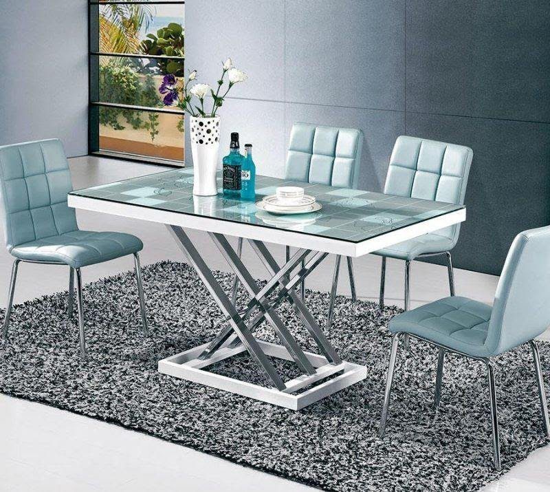 - Для обеденных столов стекло обычно применяется только для столешницы. Она может быть полностью изготовлена из этого материала или содержать его компоненты. Стекло может быть прозрачным, матовым или цветным, иногда его украшают рисунком с имитацией природных материалов – все зависит от оформления помещения.