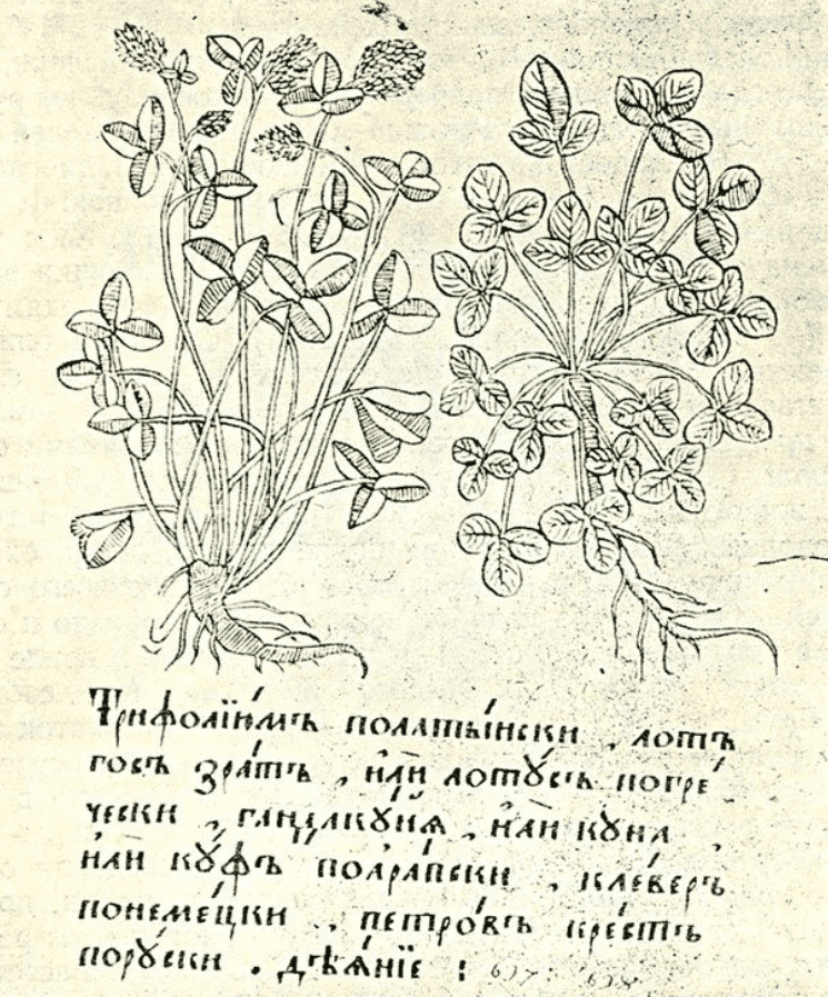 Страница из древнерусского «травника» с изображением клевера, или «петрового креста»