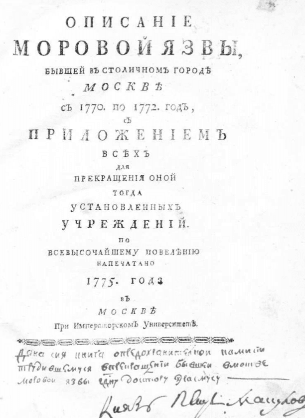 Титульная страница труда о чуме, подготовленной Афанасием Шафонским