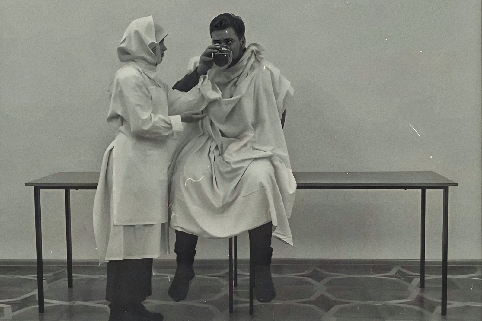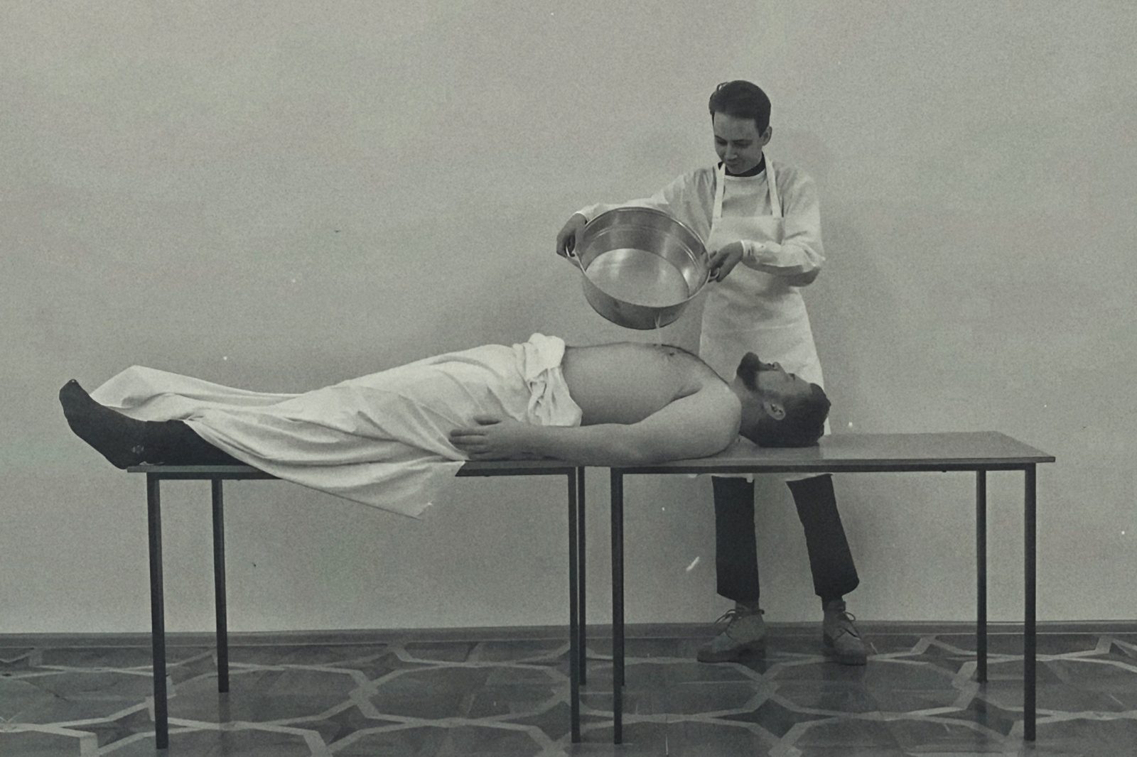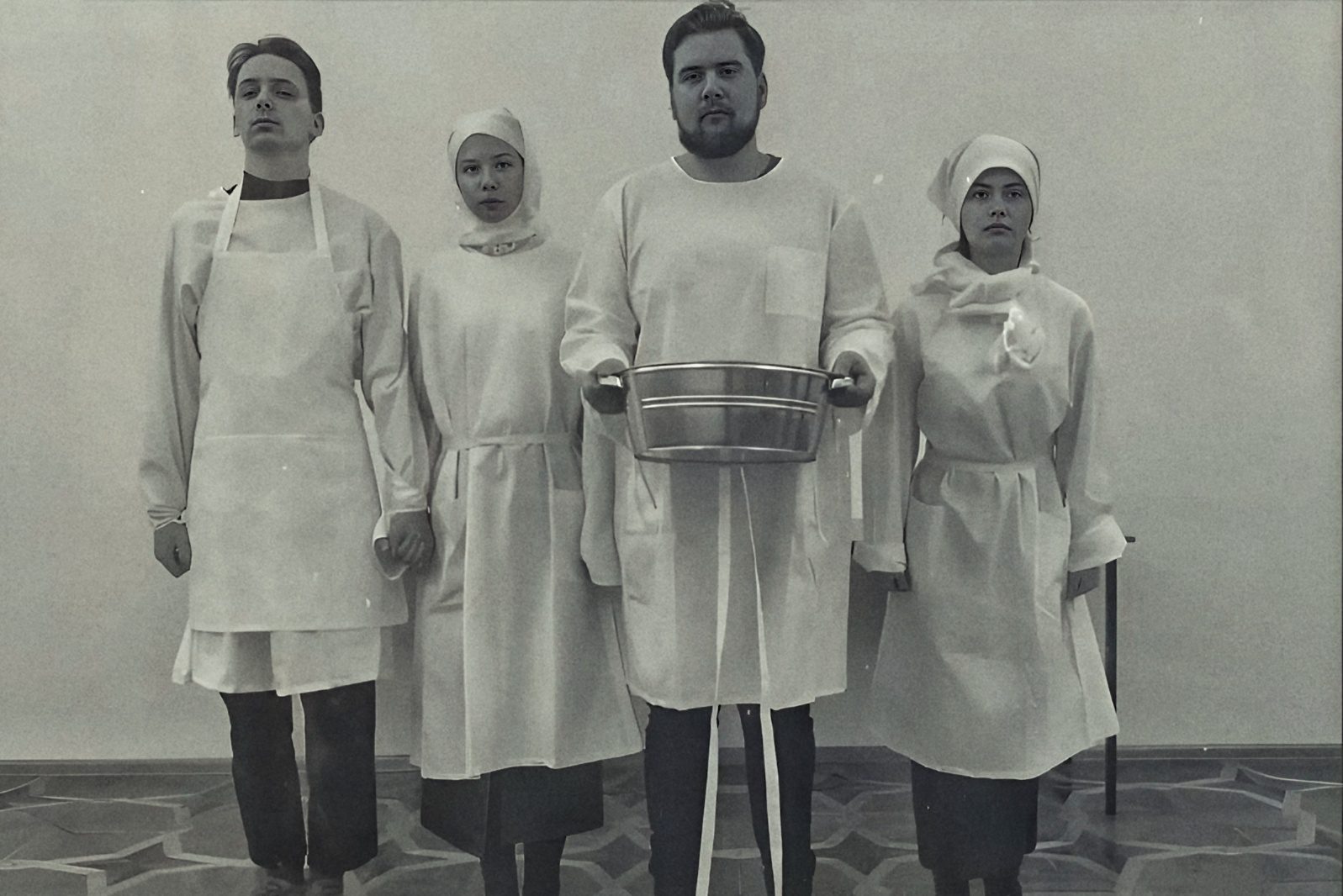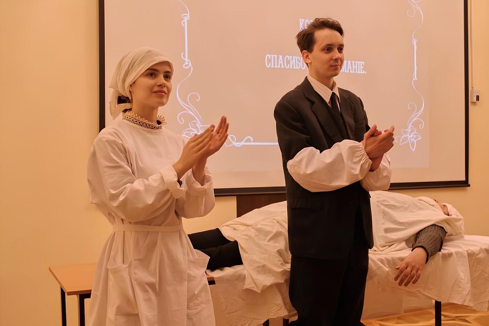 Медсестра обробляє тіло. На фото – актори творчого об’єднання “Ніч в університеті”